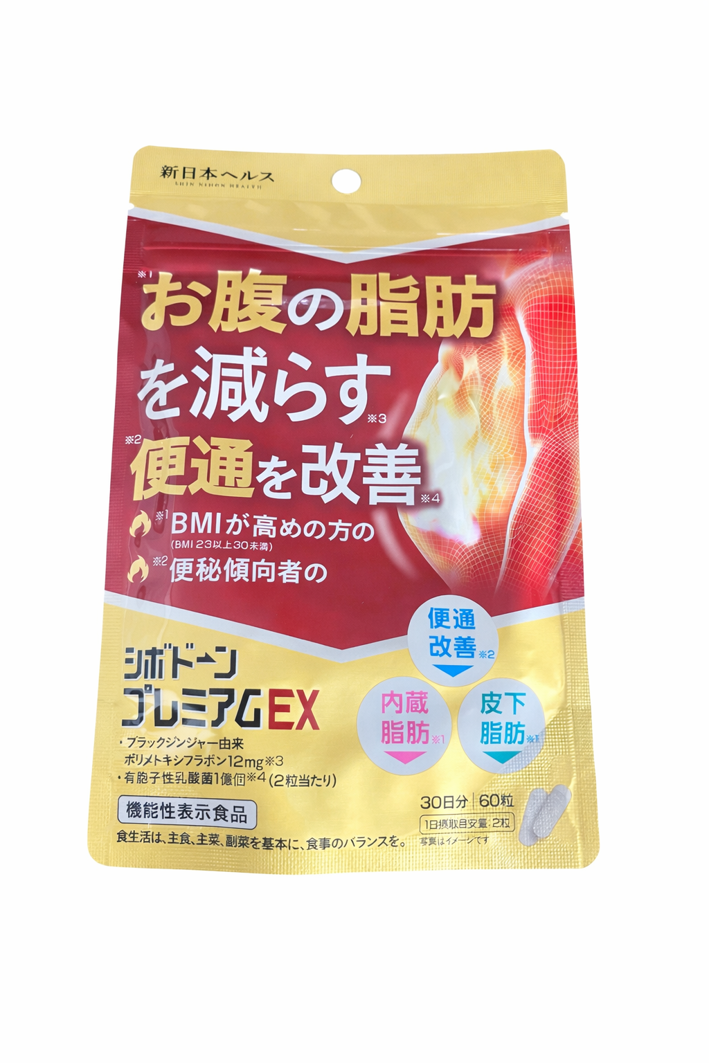 シボドーンプレミアムEXは、商品説明として便秘傾向者の便通改善に関する有胞子性乳酸菌、およびBMIが高めの方の腹部脂肪に関するブラックジンジャー由来成分が含まれています。